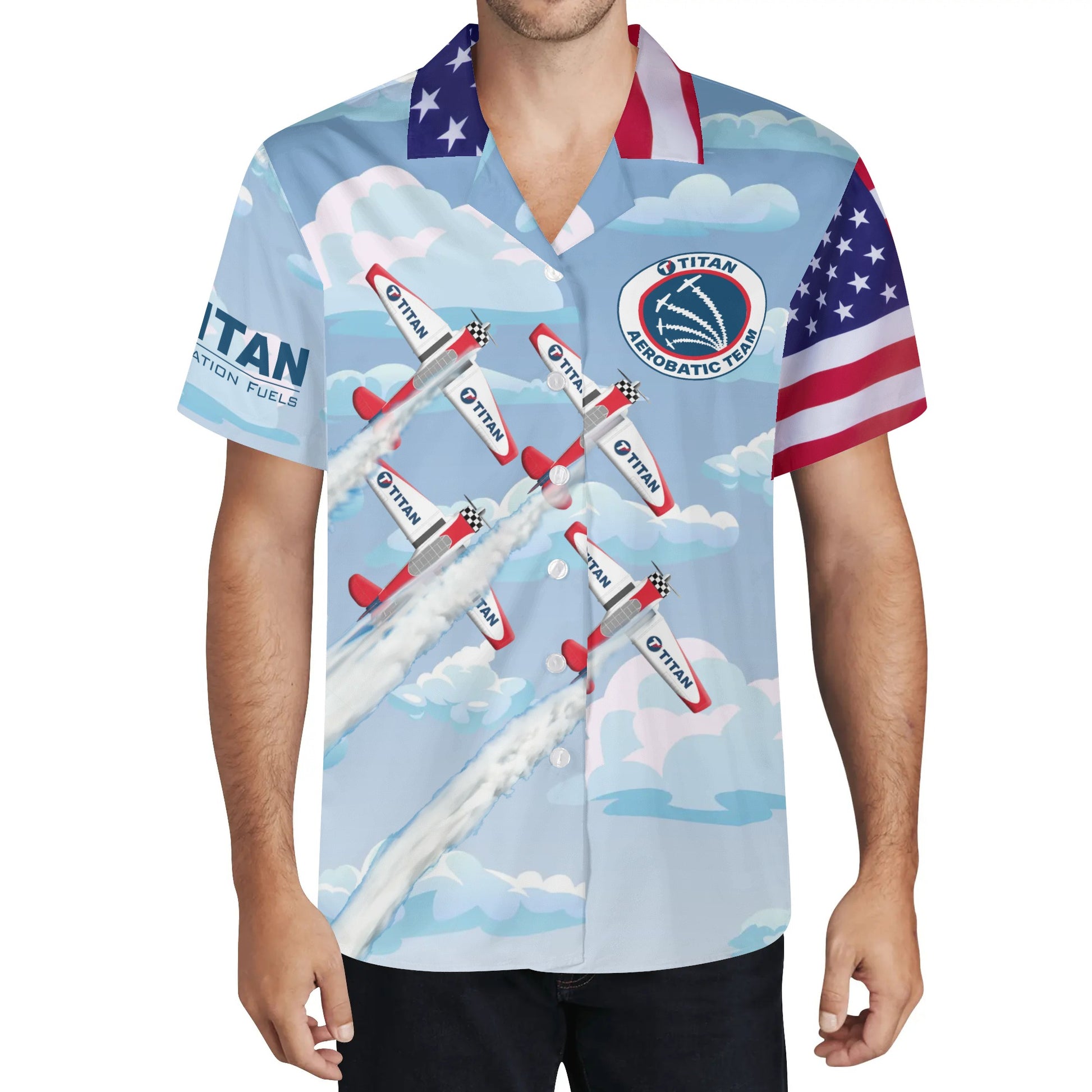 Super cool Hawaiian-style All-Over Print Shirt to celebrate the TITAN Aerobatic Team! This light and cool print makes the perfect gift for dad or you favorite aviation buff!